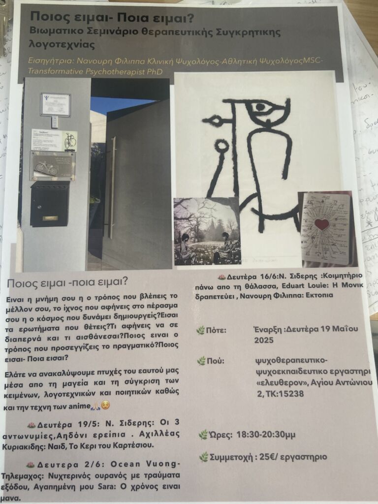 “ελευθερον” : ψυχοθεραπευτικο και ψυχοδιαγνωστικά εργαστήρι – concept lab Φιλίππα Νανουρη (Κλινική Ψυχολόγος-Αθλητική Ψυχολόγος MsC-Transformative Psychotherapist)